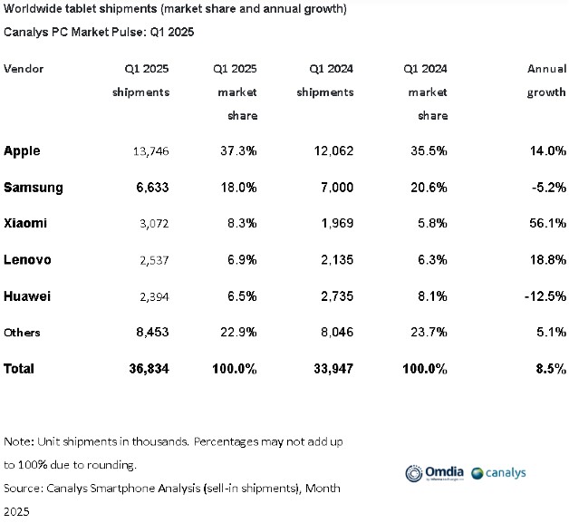 Berdasarkan data kuartal I 2025, Apple mempertahankan posisi teratas di pasar tablet global dengan pengiriman 13,7 juta unit iPad, mencatat pertumbuhan tahunan sebesar 14%. Samsung berada di peringkat kedua dengan total pengiriman 6,6 juta unit, meski mengalami penurunan 5,2% dibandingkan periode yang sama tahun lalu.