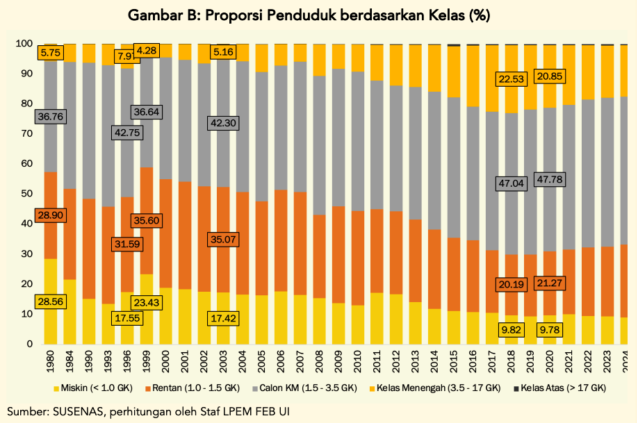 Hasil kajian mendapati, berdasarkan data terbaru 2024, terlihat bahwa terjadi tren kerentanan kelas ekonomi di Indonesia. Jumlah penduduk miskin memang turun jadi 9%. Namun, kelompok rentan miskin di negeri ini justru naik jadi 24,2%. Kelas menengah bahkan susut tinggal 17,1%, terlempar lagi ke level tahun 2017.