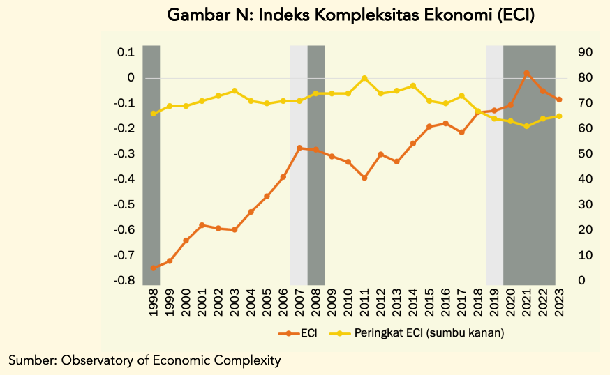Jika tren saat ini berlanjut, menurut kajian tersebut, pangsa ekspor bahan mentah RI bisa kembali ke level awal 1990-an. Ditambah dengan pertumbuhan rendah produk manufaktur bernilai tinggi dan lebih kompleks, perubahan ini tercermin dalam Indeks Kompleksitas Ekonomi (ECI), yang kembali menurun setelah 2021, membatalkan kemajuan sebelumnya.
