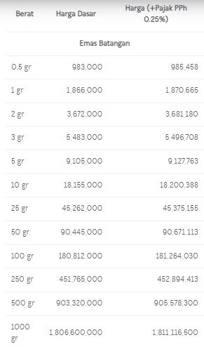 Berikut daftar harga emas batangan Logam Mulia selengkapnya: