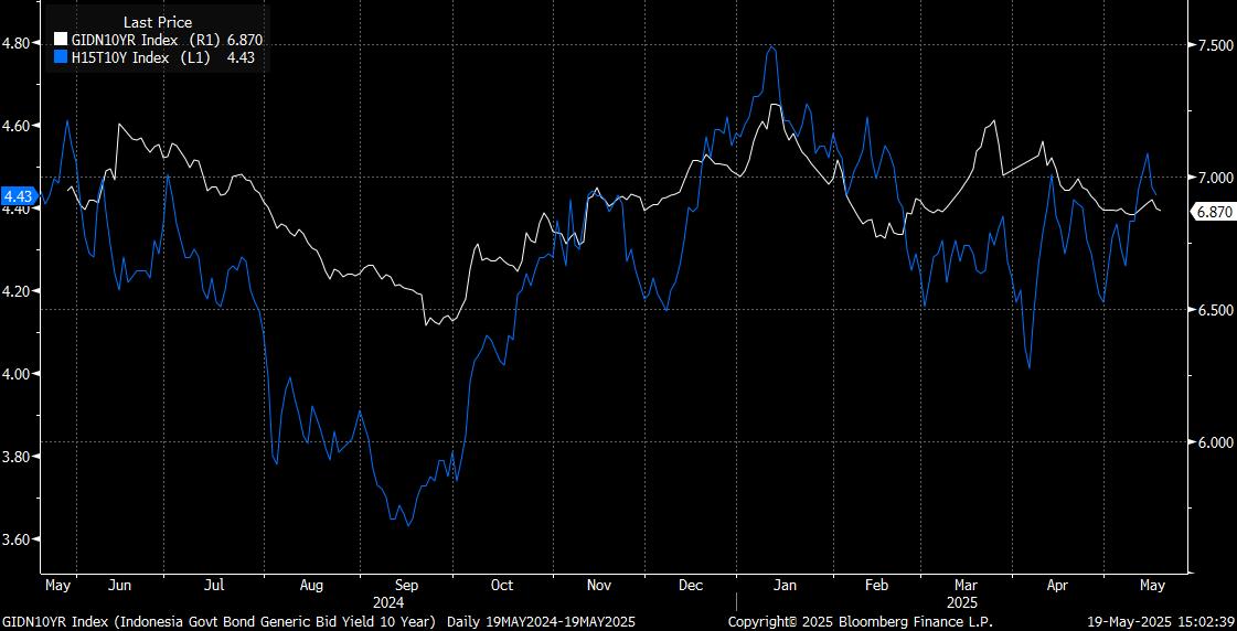 Kenaikan imbal hasil Treasury bukanlah kabar baik bagi Indonesia. Yield AS yang tinggi akan membuat daya tarik surat utang RI makin kurang menarik, karena selisih imbal hasil yang menyempit.