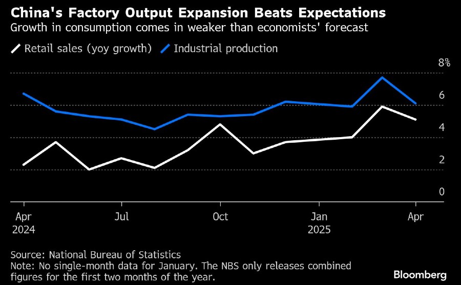 "Angka produksi industri yang cerah hanya mencerminkan satu bagian dari perekonomian," kata Raymond Yeung, Kepala Ekonom Greater di Australia & New Zealand Banking Group Ltd. "Namun, angka penjualan ritel April menunjukkan orang-orang enggan berbelanja. Untuk mencapai pertumbuhan 5%, kita masih membutuhkan konsumsi."