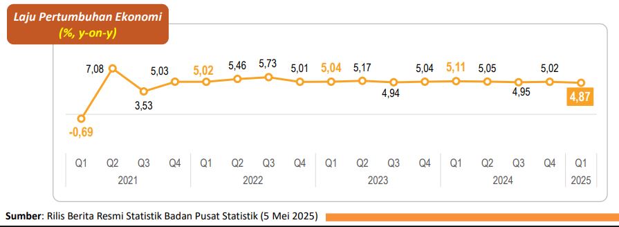 Sebelumnya, Badan Pusat Statistik (BPS) melaporkan ekonomi Indonesia hanya tumbuh 4,87% year-on-year (yoy). Ini menjadi yang terlemah sejak kuartal III-2021, saat pandemi Covid-19 varian delta mengganas sampai pemerintah terpaksa menerapkan Pemberlakuan Pembatasan Kegiatan Masyarakat (PPKM) Darurat yang membuat ekonomi ‘mati suri’.