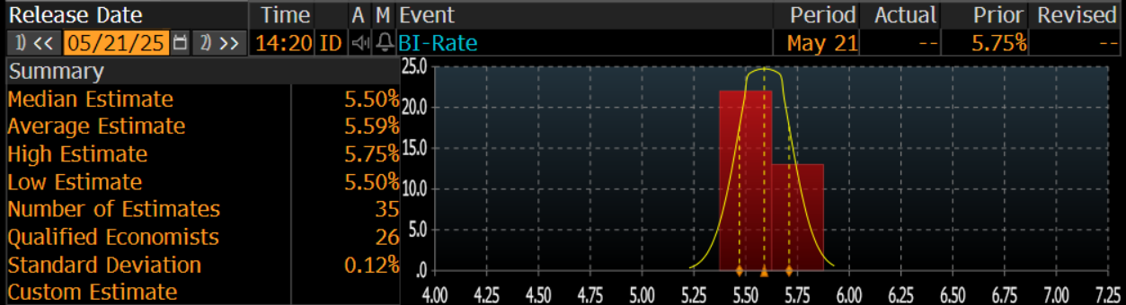 Dengan itu, konsensus pasar memperkirakan Bank Indonesia akan memangkas bunga acuan sebesar 25 basis poin menjadi 5,5%, setelah tiga bulan beruntun BI Rate ditahan di level 5,75%.