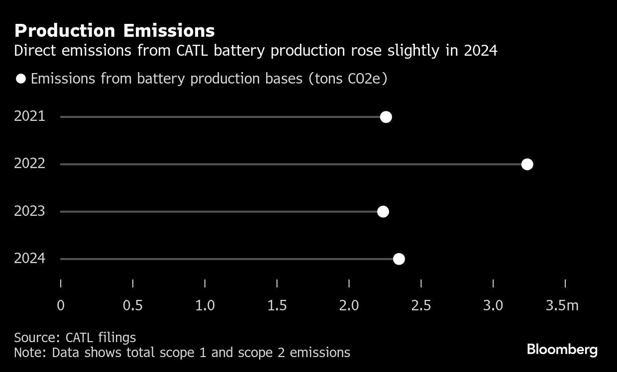 Emisi langsung di basis produksi baterai CATL naik sekitar 5% tahun lalu terhadap 2023, karena produksi melonjak hampir sepertiga kali lipat.