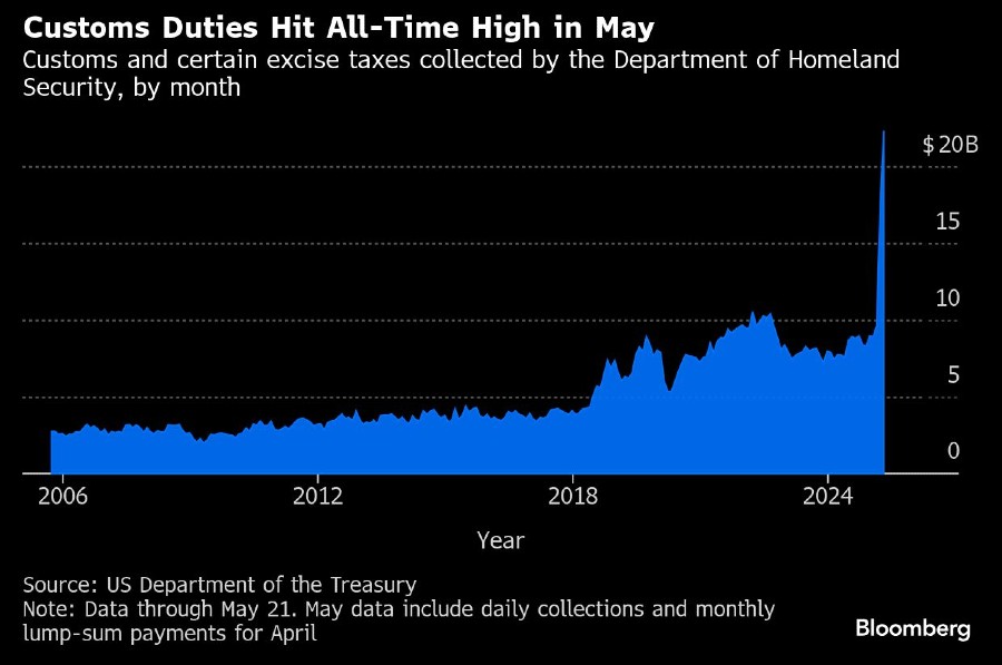 Bloomberg, Pendapatan harian dari bea cukai Amerika Serikat (AS) naik ke rekor US$16,5 miliar (sekitar Rp267,58 triliun) karena para importir AS melakukan pembayaran bulanan kepada pemerintah untuk barang-barang yang diterima di bulan April.