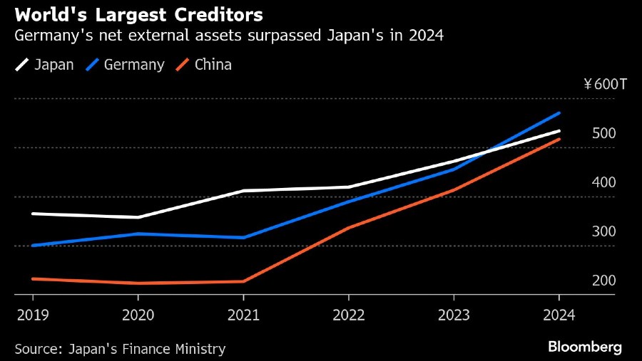 Surplus Jepang mencapai ¥29,4 triliun menurut Kementerian Keuangan, setara dengan sekitar €180 miliar. Tahun lalu nilai tukar euro terhadap yen naik sekitar 5%, membesarkan peningkatan aset Jerman dibandingkan Jepang dalam mata uang yen.