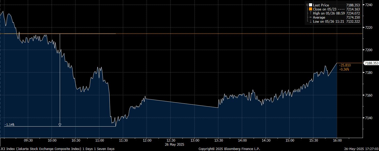 Bloomberg Technoz, Jakarta - Indeks Harga Saham Gabungan (IHSG) pada perdagangan kemarin Senin (26/5/2025) ditutup di zona merah. IHSG melemah 0,36% hingga terpeleset ke posisi 7.188,35. Lantas bagaimana dengan rekomendasi saham hari ini?