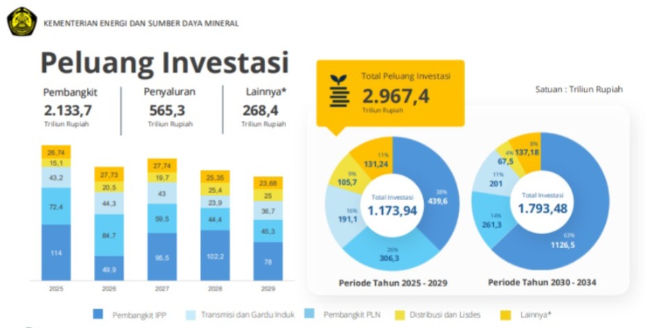 Kementerian Energi dan Sumber Daya Mineral (ESDM) mengestimasikan peluang investasi sektor kelistrikan selama 10 tahun ke depan mencapai Rp2.967,4 triliun atau Rp2,96 kuadriliun, sebagaimana termaktub di dalam RUPTL 2025—2034, terbagi menjadi dua kelompok periode.