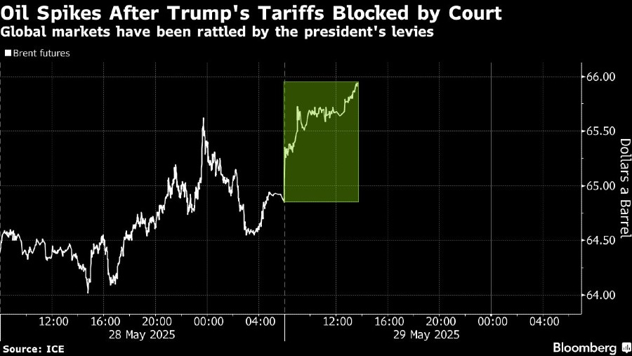 BLoomberg, Minyak naik bersama pasar ekuitas setelah pengadilan perdagangan Amerika Serikat memblokir banyak tarif global Presiden Donald Trump, dan menganggapnya ilegal.