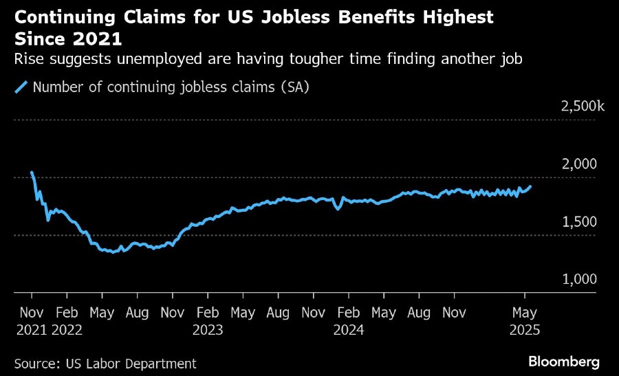Bloomberg, Pengajuan klaim berulang untuk tunjangan pengangguran AS melonjak ke level tertinggi sejak November 2021, yang mungkin menandakan adanya peningkatan tingkat pengangguran bulan ini.