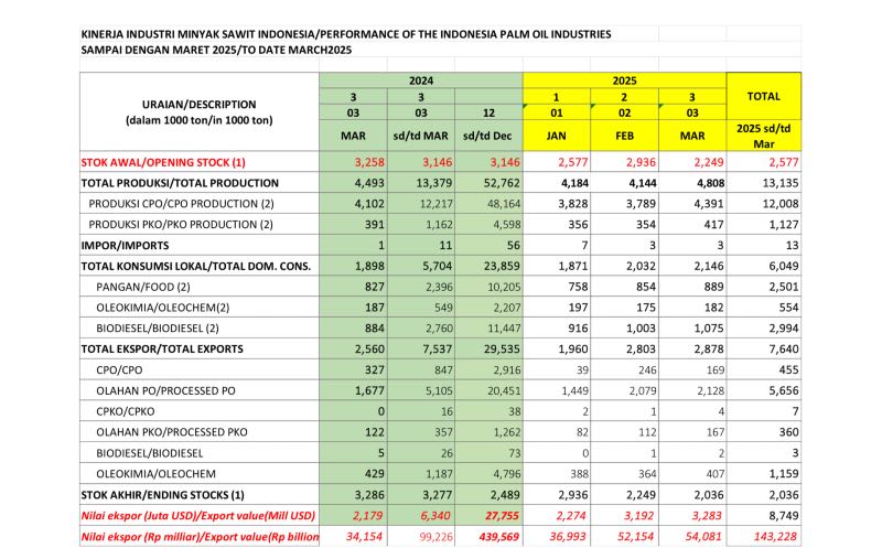 Dari sisi ekspor, volume pengiriman produk sawit Indonesia pada Maret 2025 mencapai 2.878 ribu ton, naik 75 ribu ton dari Februari yang sebesar 2.803 ribu ton. Kenaikan ekspor terjadi pada hampir semua produk, kecuali CPO mentah yang justru mengalami penurunan dari 246 ribu ton pada Februari menjadi 169 ribu ton pada Maret.