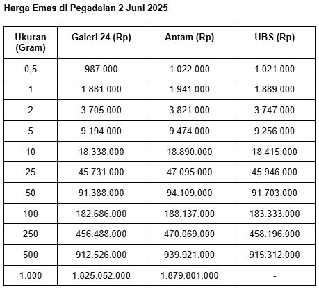 Pada Senin (25/6/2025), harga emas batangan cetakan PT Aneka Tambang (Persero) Tbk di Pegadaian untuk ukuran 0,5 gram adalah Rp 1.022.000. Sementara untuk ukuran 1 gram, harga emas Antam di Pegadaian adalah Rp 1.941.000.