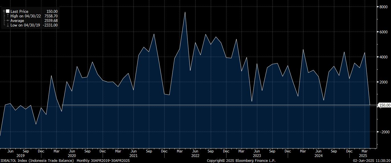 Nilai surplus dagang RI pada April tercatat hanya US$ 158,8 juta, jauh di bawah perkiraan pasar yang memprediksi masih akan ada surplus sebesar US$ 2,8 miliar.