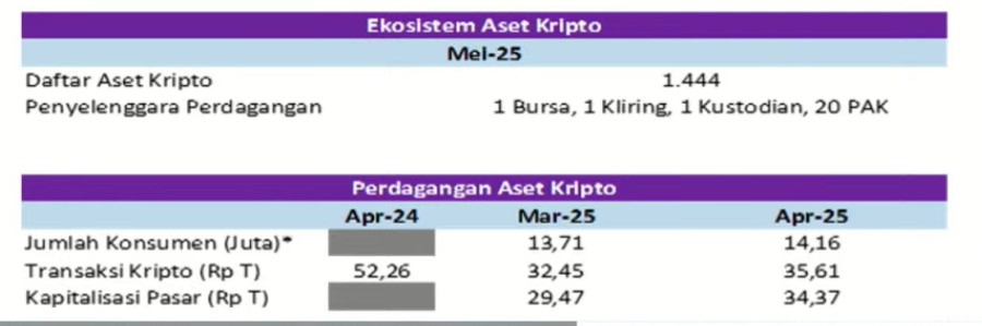 Sementara kapitalisasi pasar seluruh aset kripto per April 2025 mencapai Rp34,37 triliun, naik 16,62% mtm dibandingkan Maret 29,47 triliun.