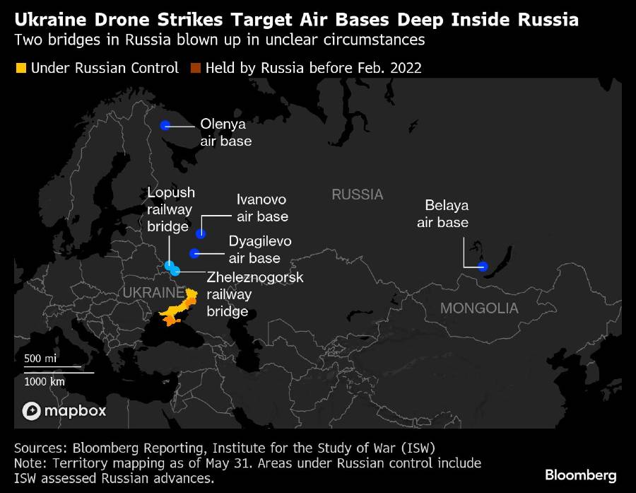 Kementerian Pertahanan Rusia dalam pernyataan di Telegram mengonfirmasi serangan terjadi di lima pangkalan udara militer di seluruh negeri dari Timur Jauh dan Siberia timur hingga lokasi-lokasi yang hanya berjarak beberapa ratus mil dari Moskow.