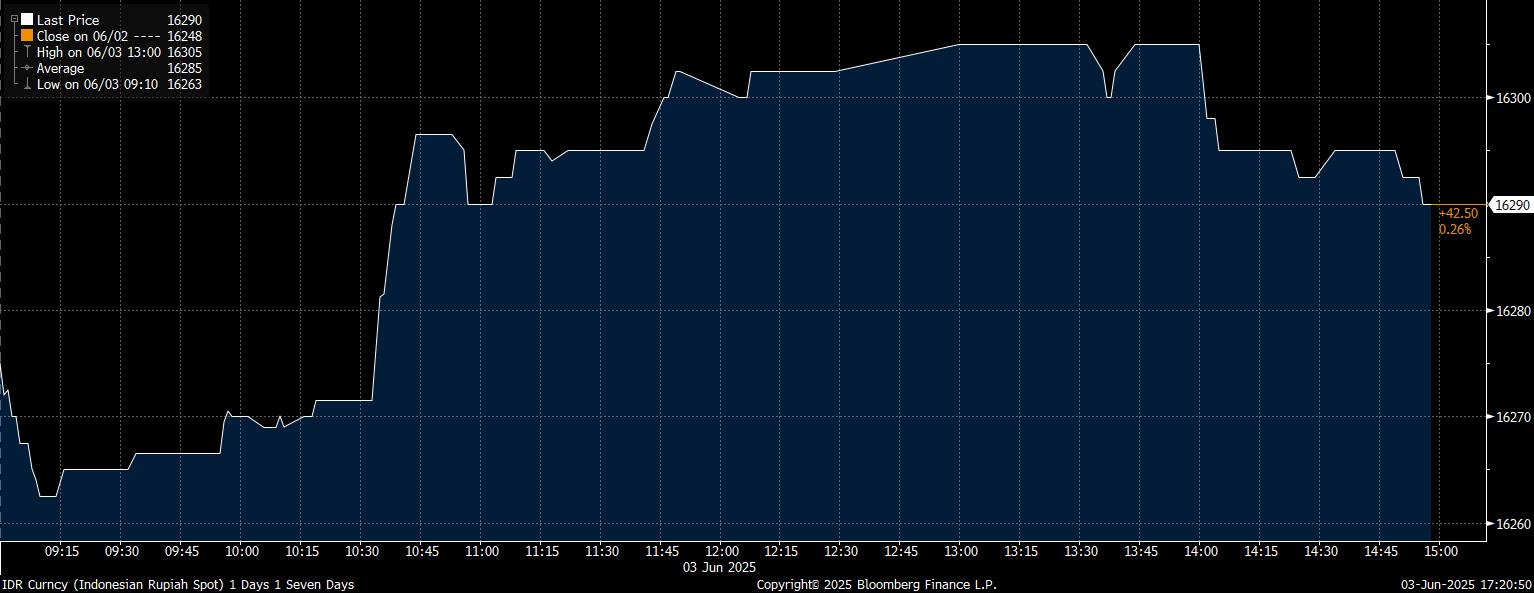 Dalam intraday trading hari ini rupiah sempat menyentuh level terlemahnya di Rp16.305/US$, terlebih hingga menjadi yang terlemah di Asia siang hari ini, tersengat sentimen kehati-hatian akan risiko pelebaran defisit transaksi berjalan bila tren lonjakan impor RI pada April terus berlanjut.