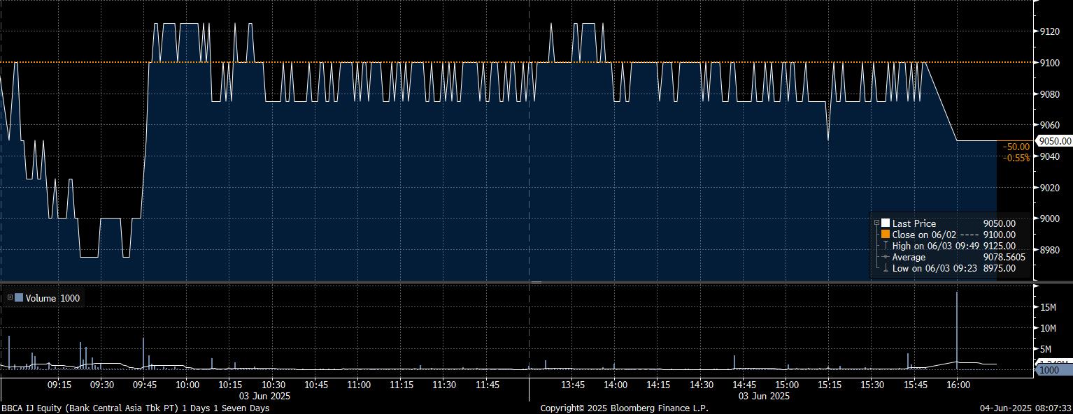 Adapun investor asing net sell yang besar pada saham PT Bank Central Asia Tbk (BBCA) mencapai Rp293,07 miliar. Imbas tekanan jual yang deras, saham BBCA melemah 0,55% dan ditutup di posisi Rp9.050/saham.