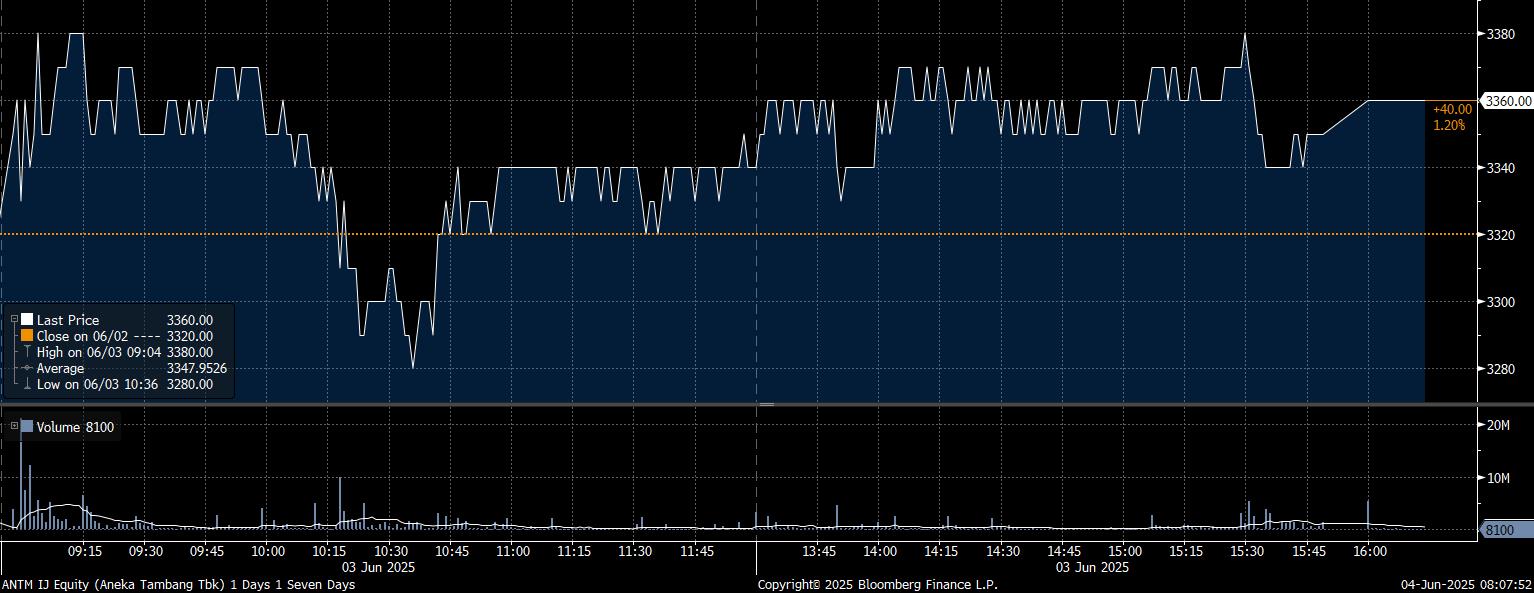 Sedang, investor asing mencatatkan net buy terbanyak pada saham PT Aneka Tambang Tbk (ANTM) mencapai Rp141,76 miliar. Sejalan dengan dengan tren pembelian, saham ANTM menguat 1,2% hingga ada di posisi Rp3.360/saham.