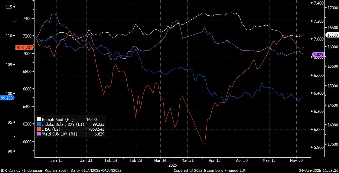 Kesemua faktor musiman itu muncul di tengah pasar yang masih dibayangi ketidakpastian, terutama perihal perang dagang. De-eskalasi antara Tiongkok dan AS yang sempat terjadi, kini mulai panas lagi. Tenggat waktu pemberlakuan tarif resiprokal pada awal Juli, juga mungkin akan membuat tekanan di pasar membesar.