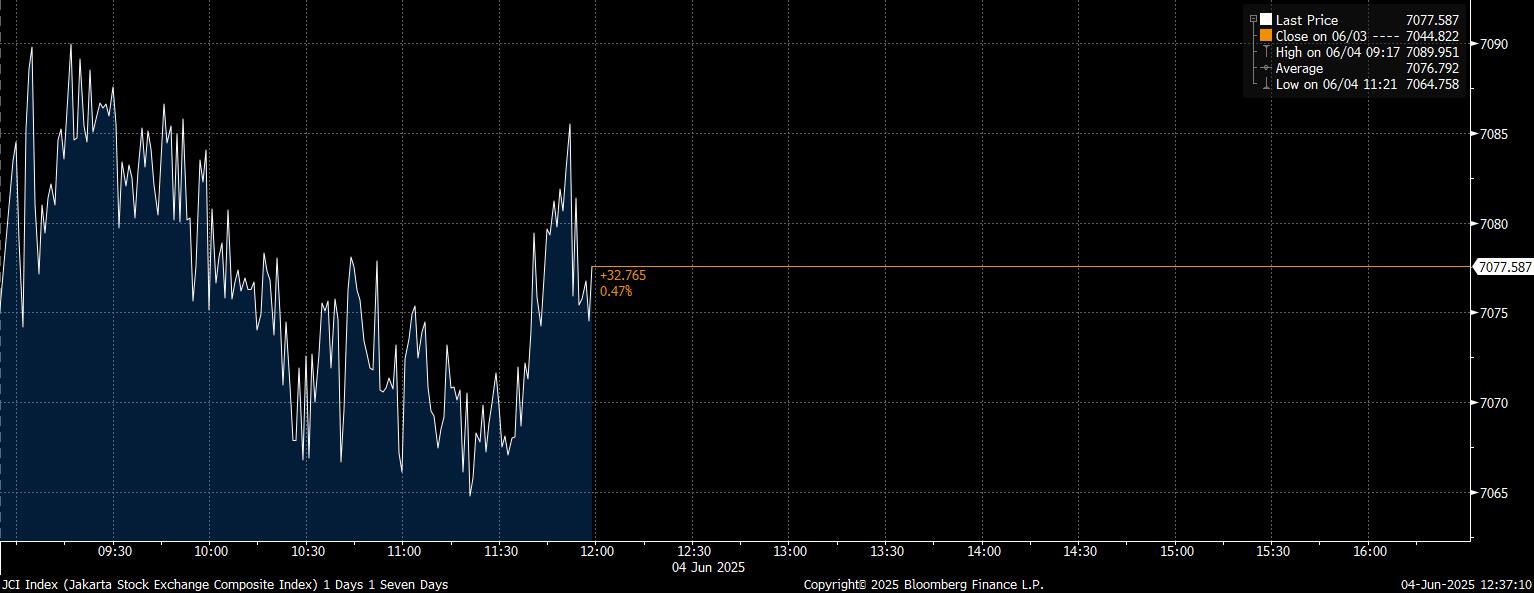 Bloomberg Technoz, Jakarta - Indeks Harga Saham Gabungan (IHSG) berhasil menutup perdagangan Sesi I di zona hijau dengan kenaikan 32,76 poin atau menguat 0,47% ke level 7.077,58 pada perdagangan Rabu (4/6/2025) seiringan dengan harga saham KFC Indonesia (FAST) yang melesat.