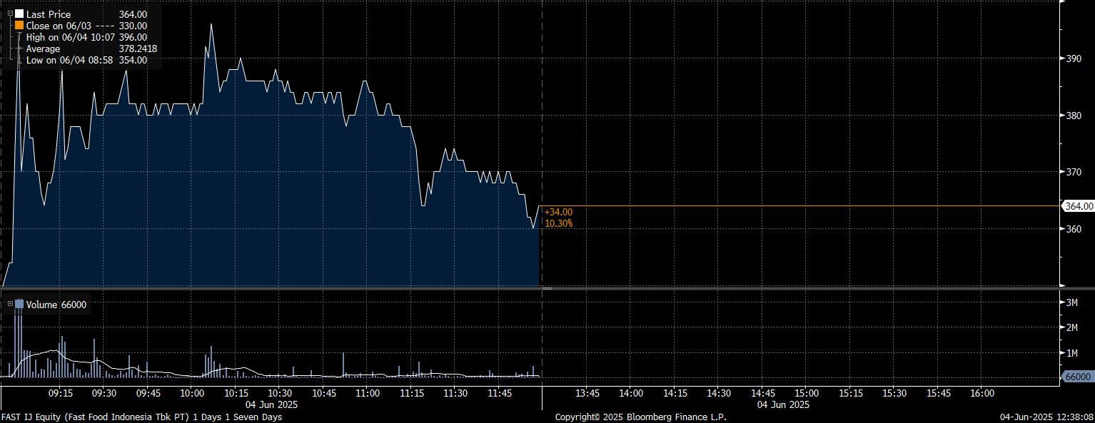 Saham FAST berhasil menguat 34 poin atau mencapai kenaikan 10,3% ke level Rp364/saham usai sebanyak 46 juta saham ditransaksikan. Adapun nilai transaksi saham pengelola KFC di siang hari ini mencapai Rp17,47 miliar.