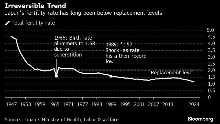 Menurut rilis Kementerian Kesehatan, Rabu (4/6/2025), tingkat kesuburan total—jumlah rata-rata anak yang mungkin akan dilahirkan seorang wanita selama masa suburnya—turun menjadi 1,15, dari 1,2 pada tahun sebelumnya, yang menandai angka terendah dalam catatan sejak 1947. Tren ini terutama menonjol di Tokyo, di mana angkanya di bawah 1 untuk tahun kedua berturut-turut.
