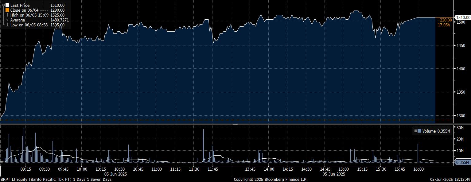 Saham-saham Grup Barito milik Prajogo Pangestu keseluruhannya kompak dipimpin oleh saham BRPT, susul TPIA, BREN, CUAN, dan PTRO. Terlebih saham BRPT berhasil menguat mencapai 17%.