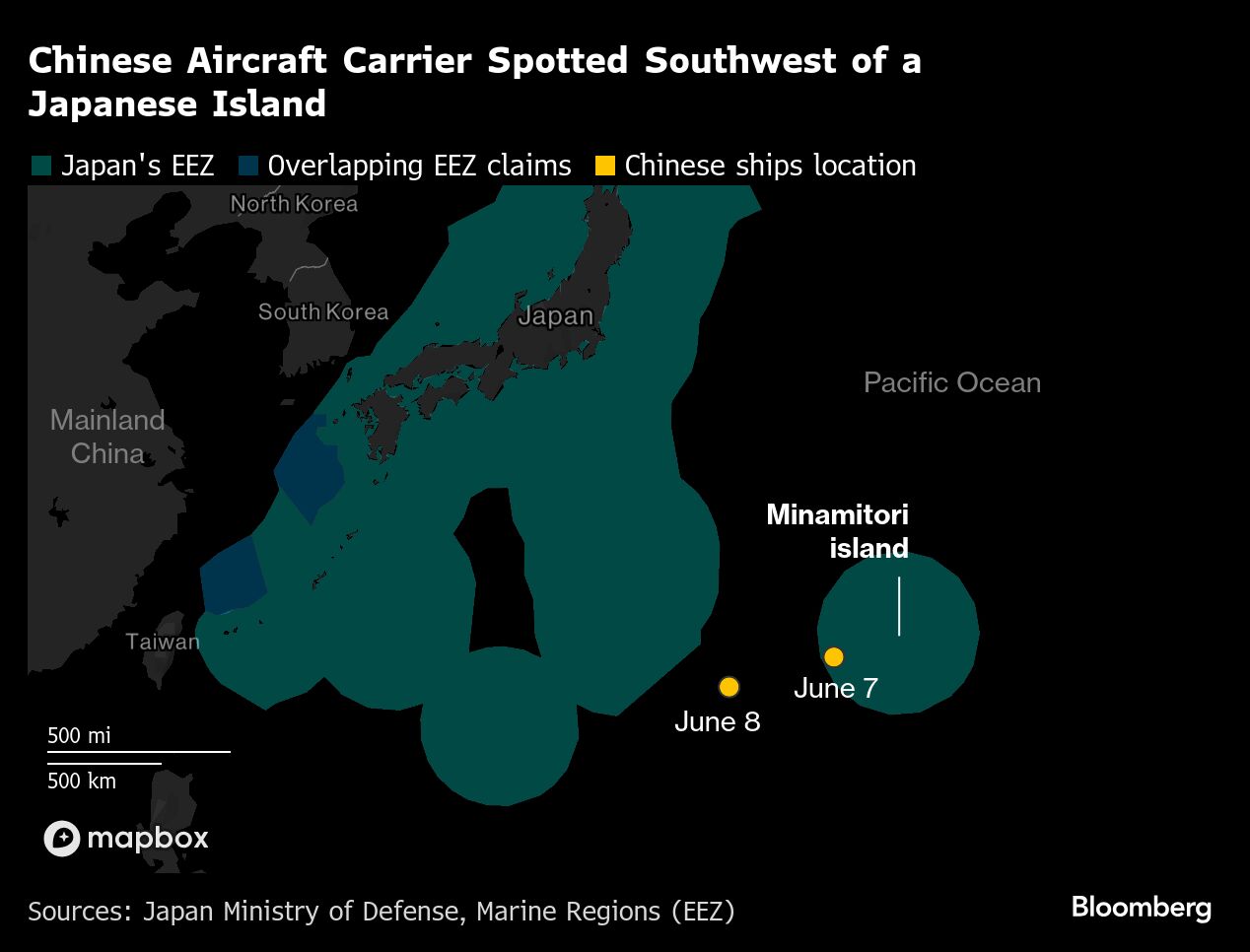Minamitori berada lebih dari 1.800 km di tenggara Tokyo. Kapal induk China itu berada di dalam zona ekonomi eksklusif Jepang di sekitar pulau itu.