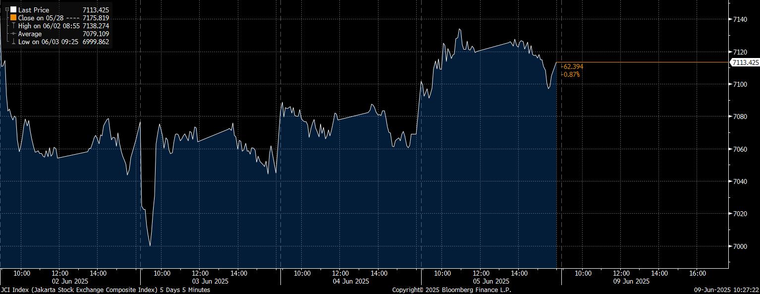 IHSG menutup perdagangan saham sepekan dengan nyaris ada di level terendah 6.994,15. Adapun level tertinggi sempat tersentuh sesaat 7.152,91 yang terjadi pada perdagangan Kamis (5/6/2025) siang.