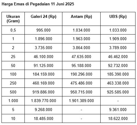 Sedangkan untuk ukuran 1 gram, harga emas Galeri 24 di Pegadaian adalah Rp 1.896.000. Terdongkrak Rp 5.000 dibandingkan hari sebelumnya.