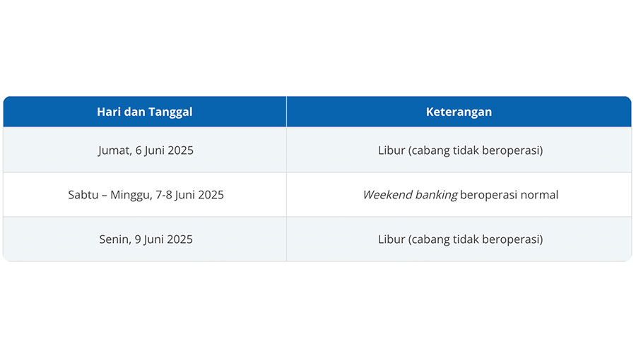 Selama periode libur Iduladha 2025, nasabah tetap dapat menikmati kemudahan layanan perbankan BCA secara aman melalui aplikasi myBCA, BCA mobile, internet banking (KlikBCA), serta jaringan ATM BCA yang tersebar luas. Seluruh kantor cabang BCA akan kembali beroperasi secara normal pada Selasa, 10 Juni 2025.