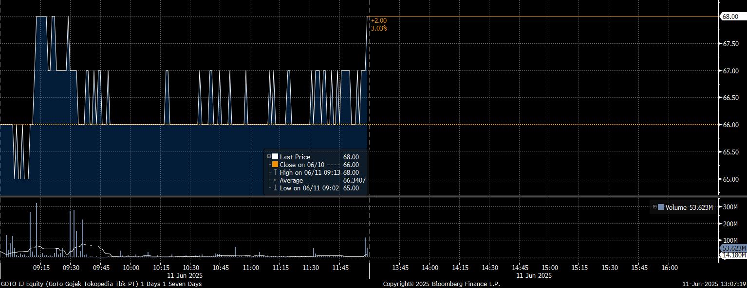 - GoTo Gojek Tokopedia (GOTO) menguat 3% Rp68/saham