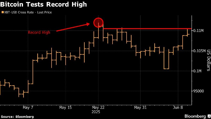 Bitcoin tercatat masih menanjak sebanyak 1,7% menjadi US$110.572 pada hari Selasa dini hari, sebelum diperdagangkan sedikit terkoreksi. Mata uang digital ini mencapai rekor US$111,980 pada 22 Mei. Ether, mata uang kripto terbesar kedua, naik sebanyak 8,3%.