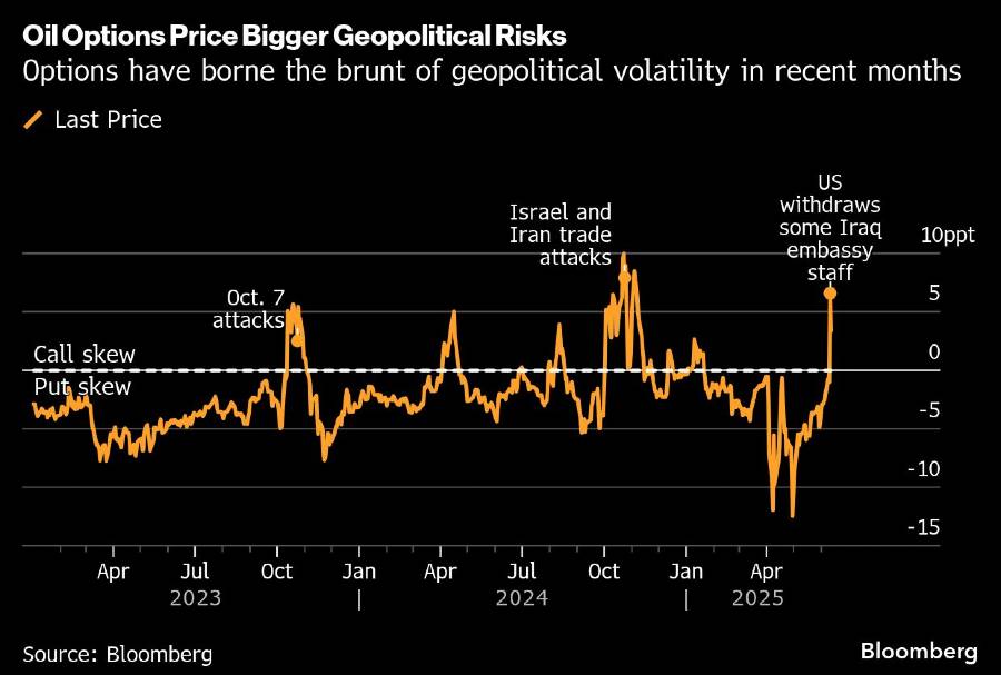 Ada pula pergeseran besar dalam penetapan harga opsi karena para pedagang menilai risiko eskalasi—opsi beli yang optimis melonjak pada Rabu ke premi tertinggi di atas opsi jual yang pesimis sejak November, sementara volatilitas meningkat ke level tertinggi hanya dalam waktu satu bulan dan volume opsi juga melonjak.