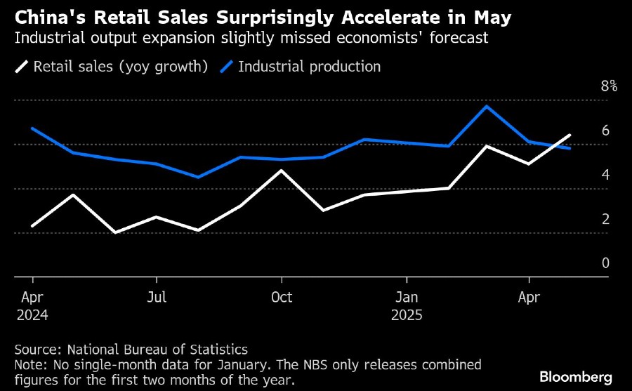 Bloomberg, Konsumsi domestik China secara mengejutkan melonjak pada Mei, saat ekonomi berhasil melawan gejolak tarif. Hal ini memberikan dorongan kepercayaan bagi Beijing di tengah ancaman perang dagang yang berkepanjangan dengan AS.