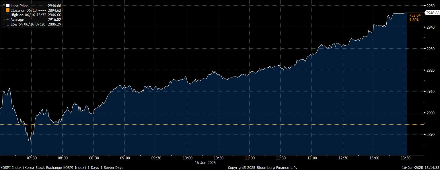 KOSPI (Korea Selatan) memimpin penguatan 1,8%, disusul oleh Ho Chi Minh Stock Index (Vietnam), NIKKEI 225 (Tokyo), SENSEX (India), TOPIX (Jepang), Hang Seng (Hong Kong), Shenzhen Comp. (China), Shanghai Composite (China), CSI 300 (China), serta KLCI (Malaysia).