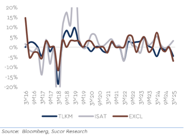 Sucor Sekuritas juga menyoroti yang menjadi ancaman TLKM adalah adanya penyempitan kesenjangan ARPU di antara seluruh operator, yang terutama timbul dari penurunan ARPU secara konsisten pada Telkom Indonesia, berdasarkan hasil performa Perusahaan di Kuartal I–2025.