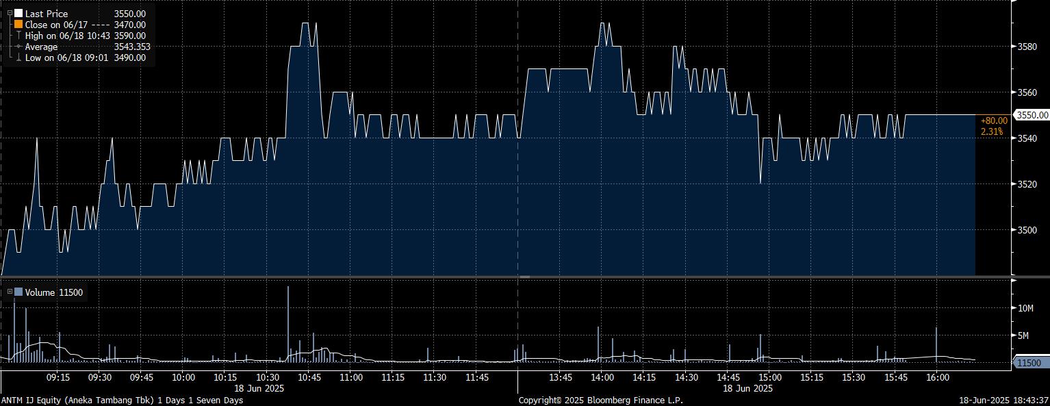 Sedang, investor asing mencatatkan net buy terbanyak pada saham PT Aneka Tambang Tbk (ANTM) mencapai Rp163,3 miliar. Sejalan dengan dengan tren pembelian, saham ANTM berhasil menguat 2,31% hingga ada di posisi Rp3.550/saham.