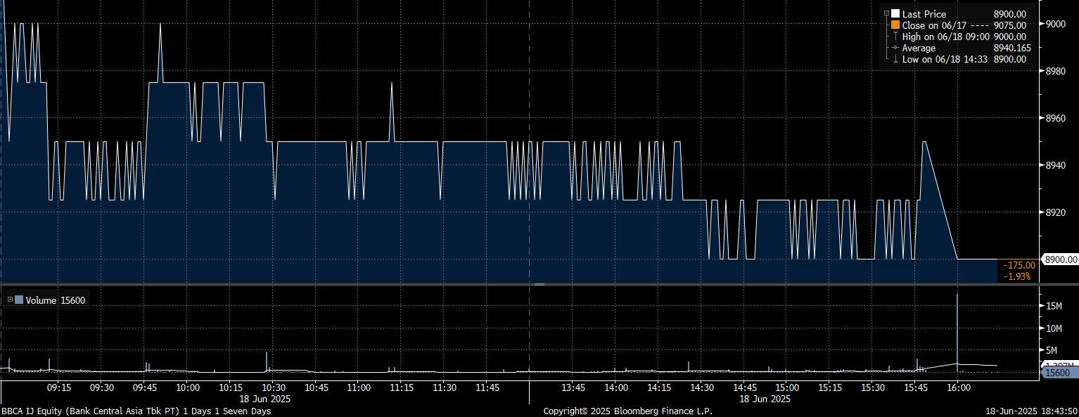 Adapun investor asing net sell yang besar pada saham PT Bank Central Asia Tbk (BBCA) mencapai Rp433,33 miliar. Imbas tekanan jual yang deras, saham BBCA melemah 1,93% hingga menutup hari di posisi Rp8.900/saham.