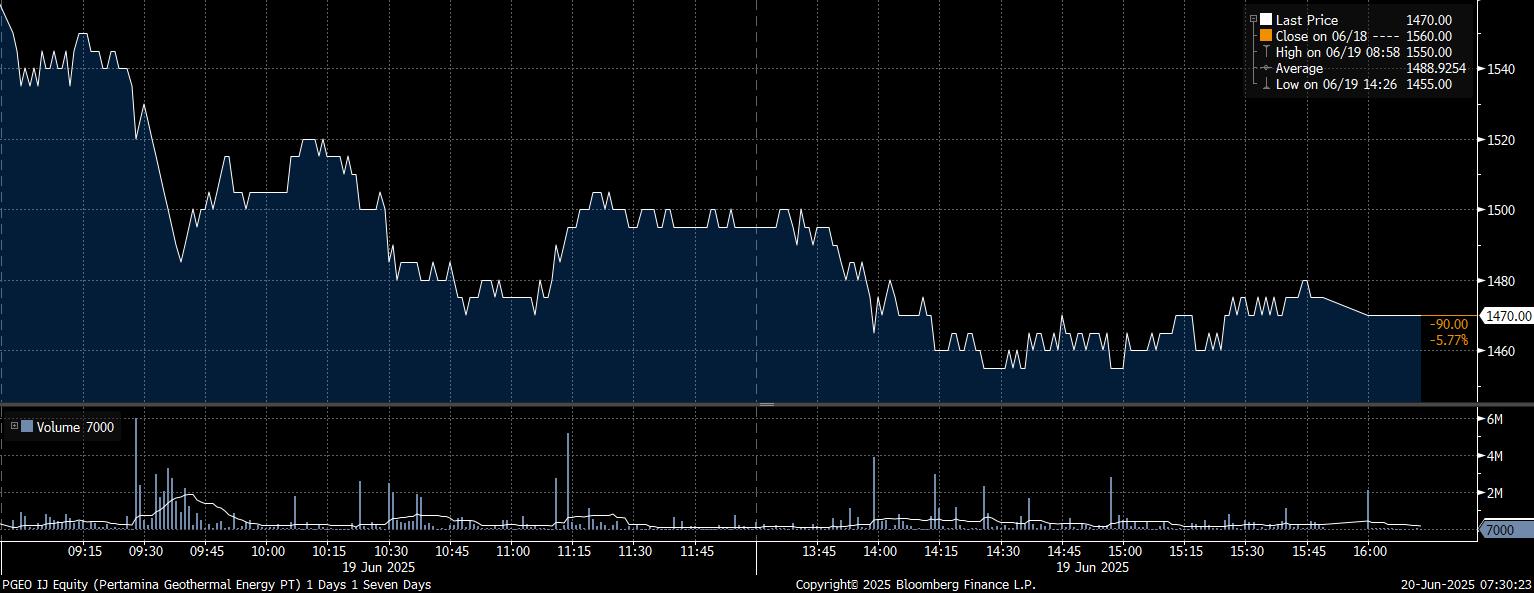 Sedang, investor asing mencatatkan net buy terbanyak pada saham PT Pertamina Geothermal Energy Tbk (PGEO) mencapai Rp42,98 miliar. Berseberangan jauh dengan dengan tren pembelian, saham PGEO justru ambles 5,77% hingga ada di posisi Rp1.470/saham.