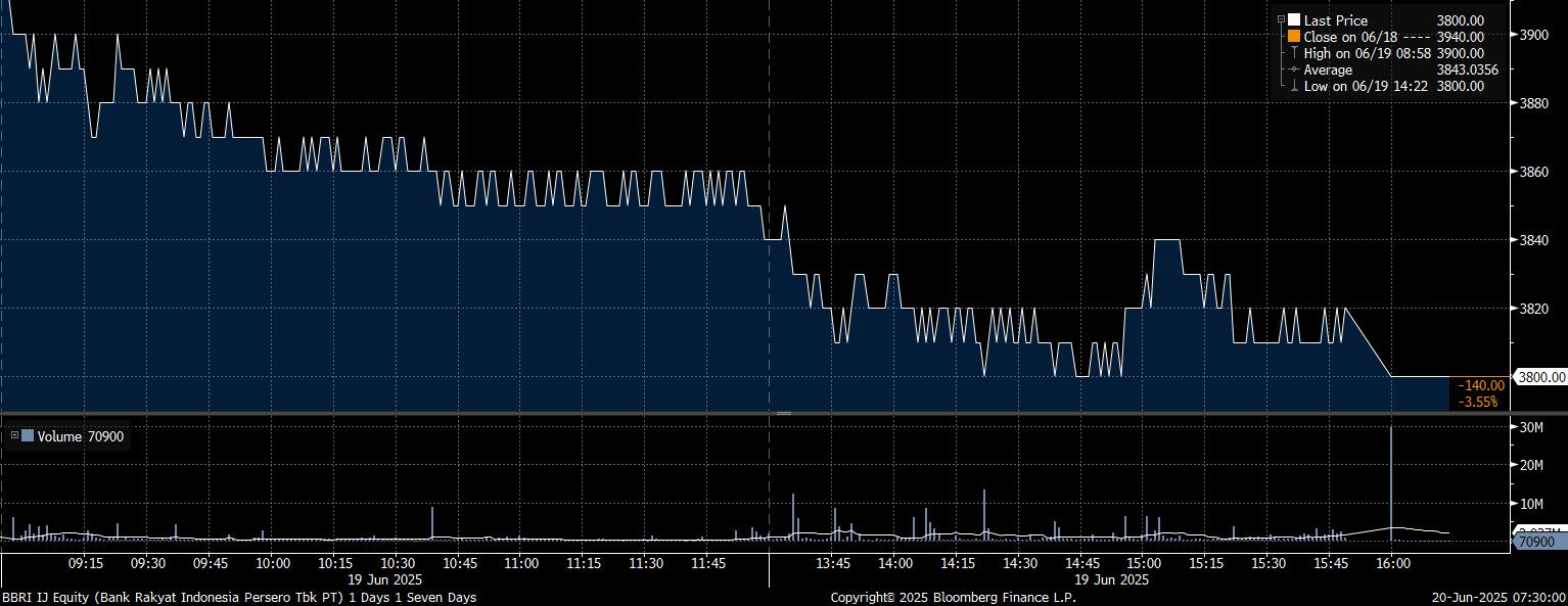 Adapun investor asing net sell yang besar pada saham PT Bank Rakyat Indonesia Tbk (BBRI) mencapai Rp524,31 miliar. Imbas tekanan jual yang deras, saham BBRI melemah 3,55% hingga menutup hari di posisi Rp3.800/saham.