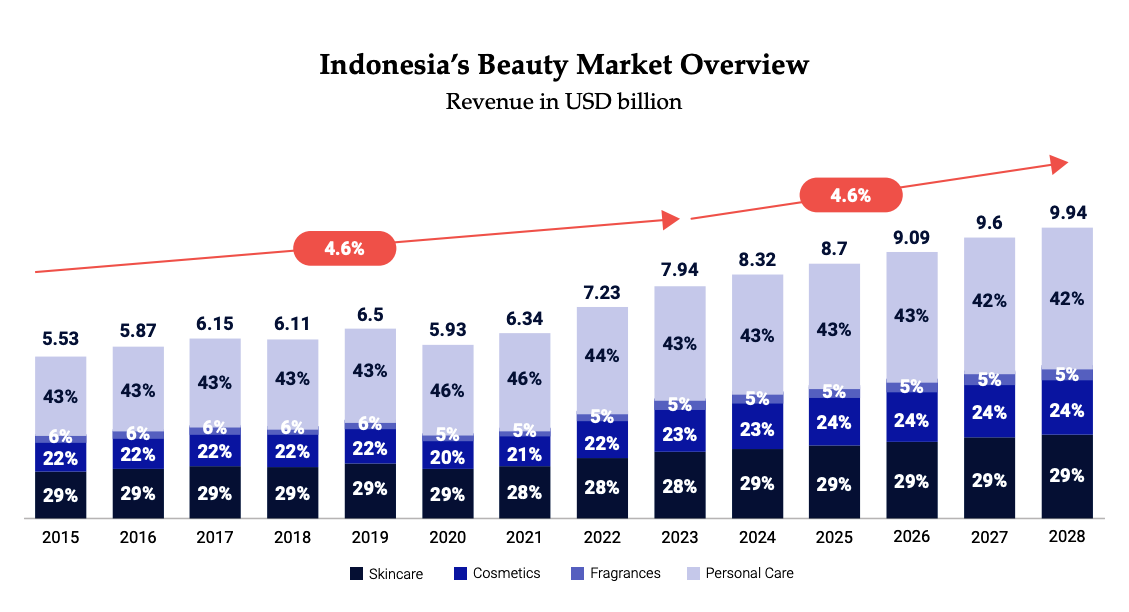 Sementara bila menghitung keseluruhan pendapatan industri kecantikan dan perawatan pribadi di Tanah Air, proyeksi riset Statista yang dilansir Februari lalu, mendapati nilai pasar industri ini diperkirakan mencapai US$ 9,7 miliar tahun ini, sekitar Rp158,8 triliun dengan potensi pertumbuhan 4,33% per tahun sampai 2030 nanti.