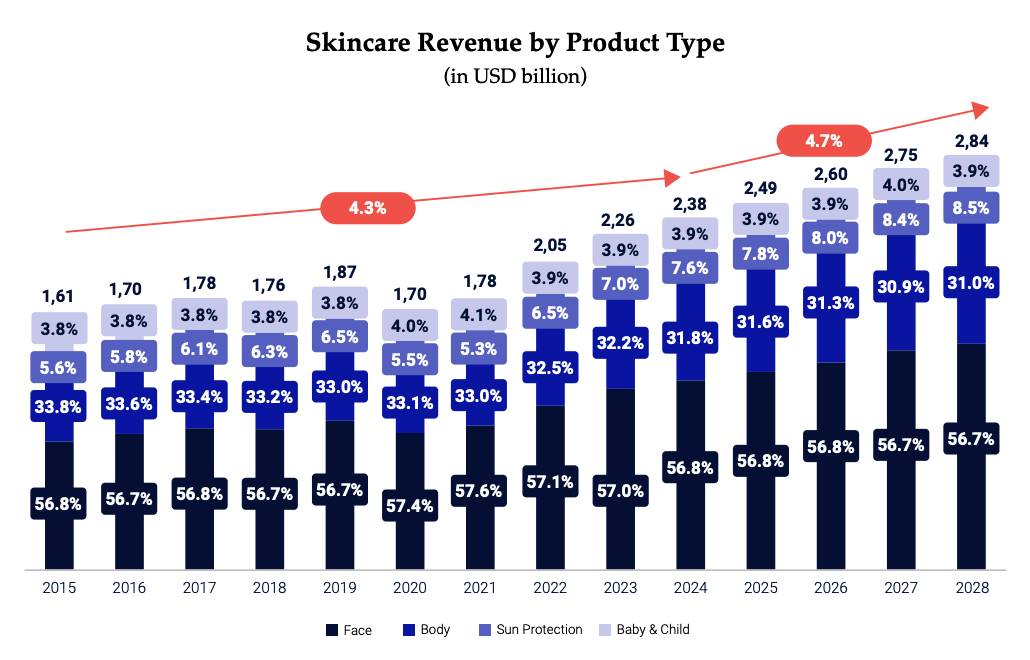 Riset yang pernah dilansir pada tahun 2024 lalu oleh YCP Solidiance Analysis, perusahaan konsultan asal Singapura, mendapati, lini bisnis perawatan wajah (facial care) masih jadi yang terbesar di industri skincare di Indonesia dengan porsi mencapai 57% dari total pasar. Produk tabir surya jadi yang terbesar di lini ini.