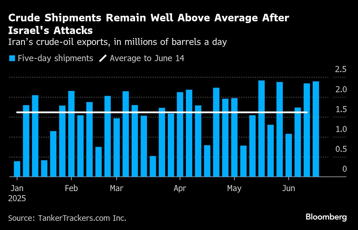 Menurut data dari TankerTrackers.com, ekspor minyak Iran rata-rata mencapai 2,33 juta barel per hari dalam lima hari sejak serangan dimulai pada 13 Juni. Angka tersebut merupakan peningkatan sebesar 44% dibandingkan dengan rata-rata untuk tahun tersebut hingga 14 Juni.