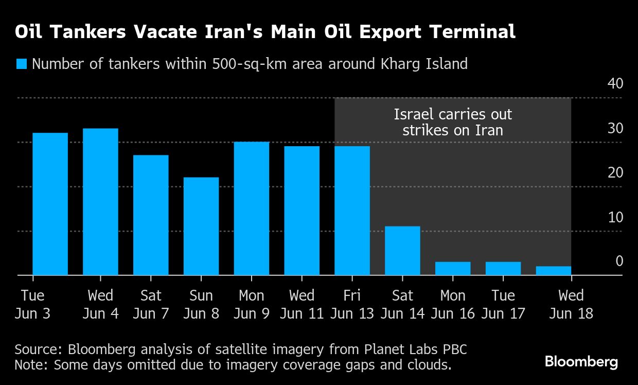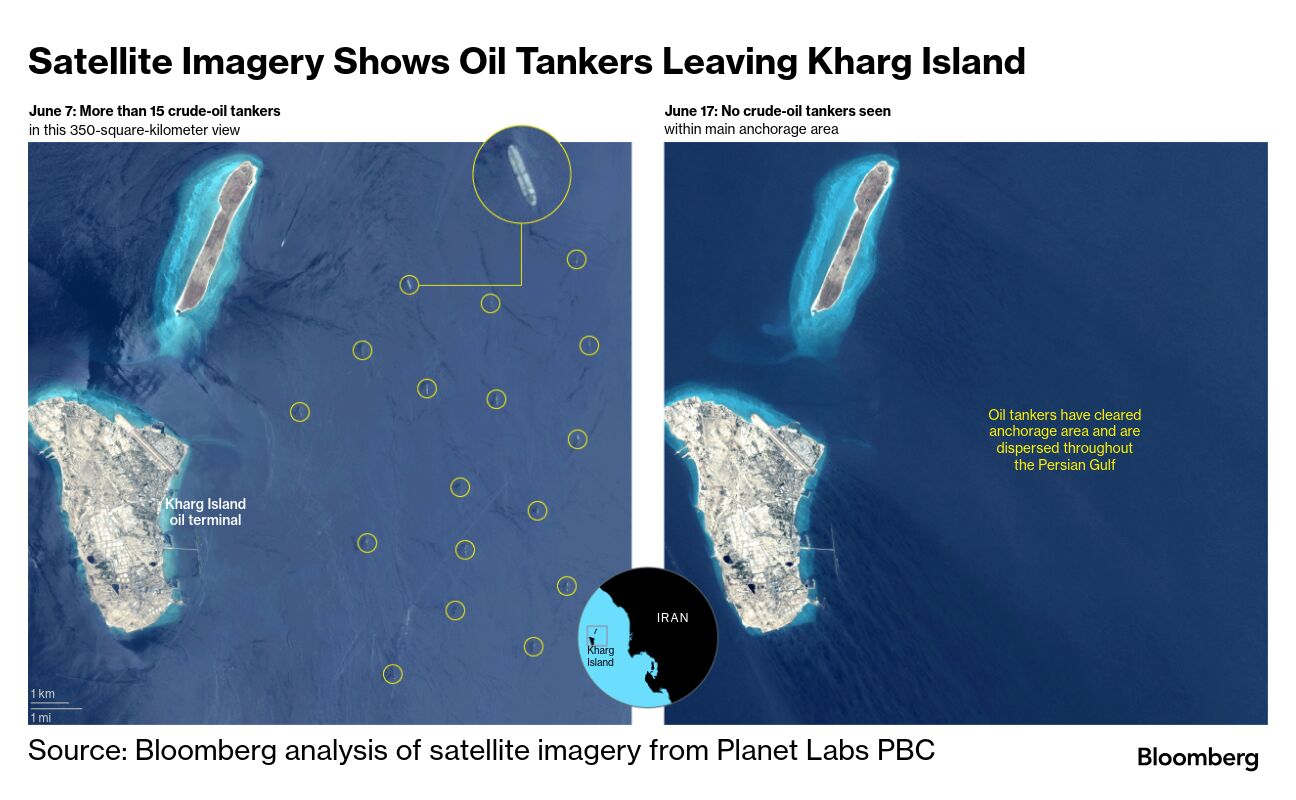 Citra satelit dari Planet Labs dari 11 Juni, beberapa hari sebelum serangan Israel pertama, memperlihatkan kapal tanker, kebanyakan dari mereka adalah pengangkut minyak mentah yang sangat besar, masing-masing mampu menampung sekitar 2 juta barel, berlabuh di perairan terlindung antara Pulau Kharg dan daratan Iran.