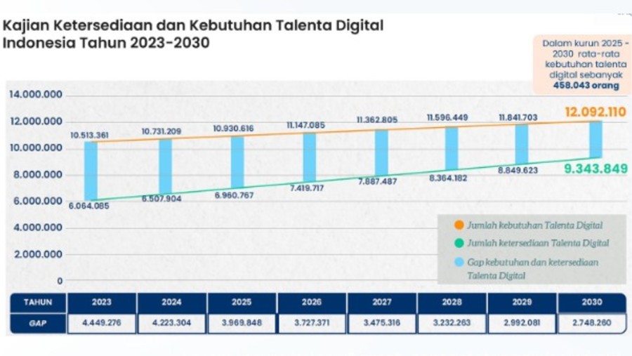 Namun, seiring berjalannya waktu, kebutuhan talenta digital kian meningkat didorong dengan supply yang juga meningkat setiap tahun. Maka kajian target tersebut berubah menjadi 450 ribu per tahun, karena gap yang kian mengecil.
