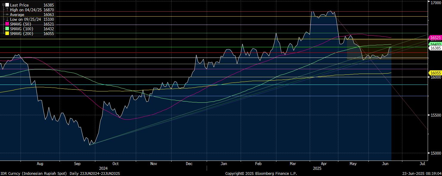 Rupiah telah mencetak kinerja mingguan terlemah dalam sembilan pekan, dengan ditutup di level Rp16.385/US$ pada pekan lalu, akibat terbebani eskalasi konflik di Timur Tengah yang diawali oleh serangan Israel pada Iran pada 13 Juni.
