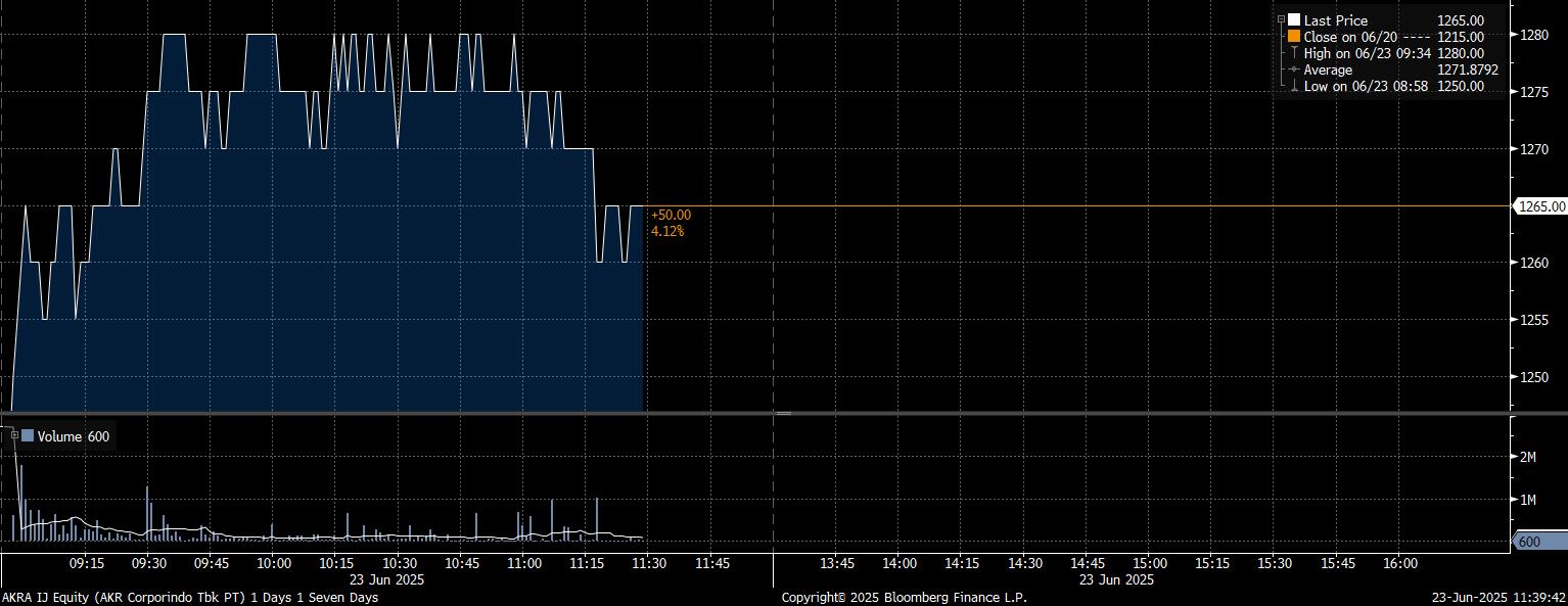Saham minyak potensial lainnya, PT AKR Corporindo Tbk (AKRA) juga meningkat 4,12% pada perdagangan pagi hari, menyusul harga minyak dunia yang melesat.