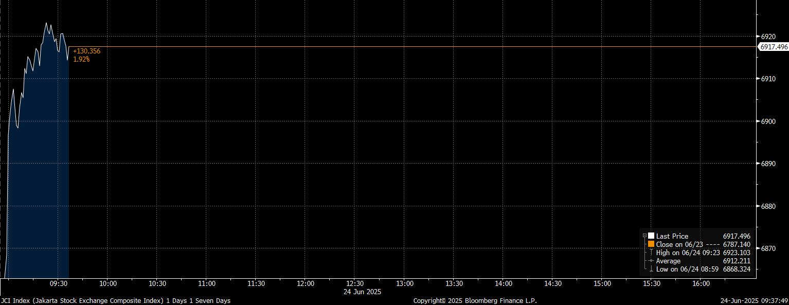 Bloomberg Technoz, Jakarta - Indeks Harga Saham Gabungan (IHSG) melesat di zona hijau dengan penguatan mencapai 1,92% dan 130,35 poin ke posisi 6.917,49 di Sesi I pagi hari pada perdagangan Selasa (24/6/2025).